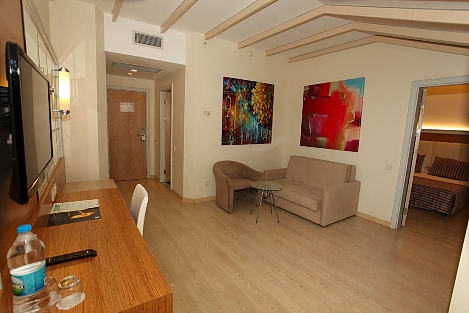 This split-level suite features a kitchenette, independent entrance, and a garden with parasol and deckchairs.